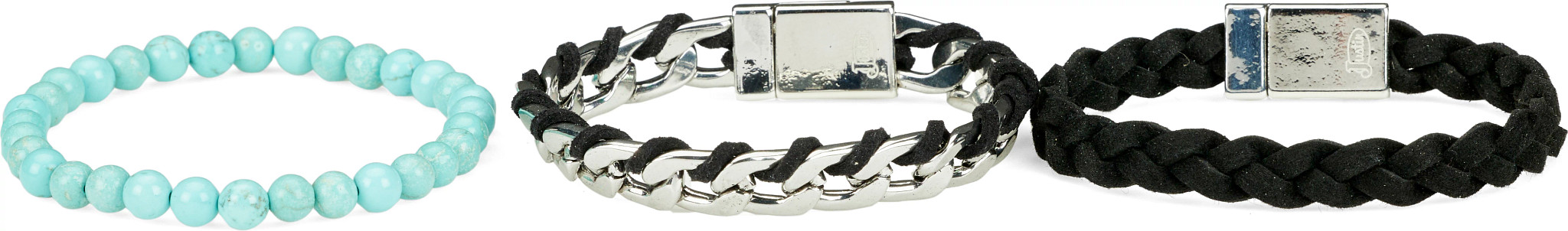 This three-piece bracelet set features a leather bracelet with a silver sliding clasp, a silver bracelet made from zinc alloy with rhodium plating that also includes a sliding clasp closure, and a turquoise pearl stretch bracelet. Each bracelet can be worn separate or worn altogether.