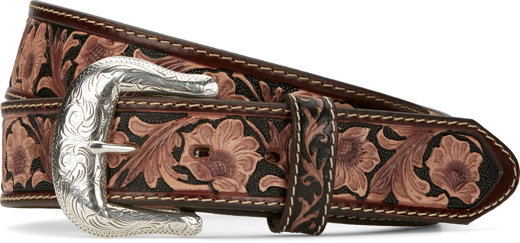 This western styled belt features a floral pattern on 100% natural veg. tan leather and a silver-plated buckle. The expertly tooled leather measures 1 1/2 inches wide. This style is Made in the USA with global parts.