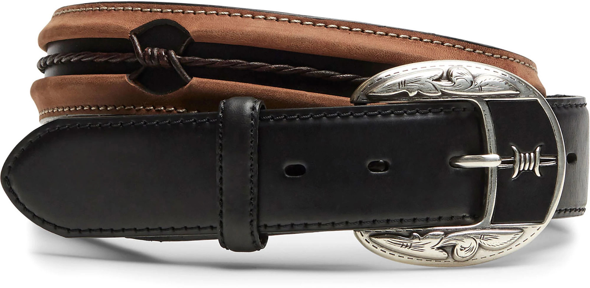 Our high-contrast Fenced In belt in copper and black features eye-catching barbed wire-inspired inset details – even on the leather-inlaid buckle. The leather measures 1 1/2 inches wide.