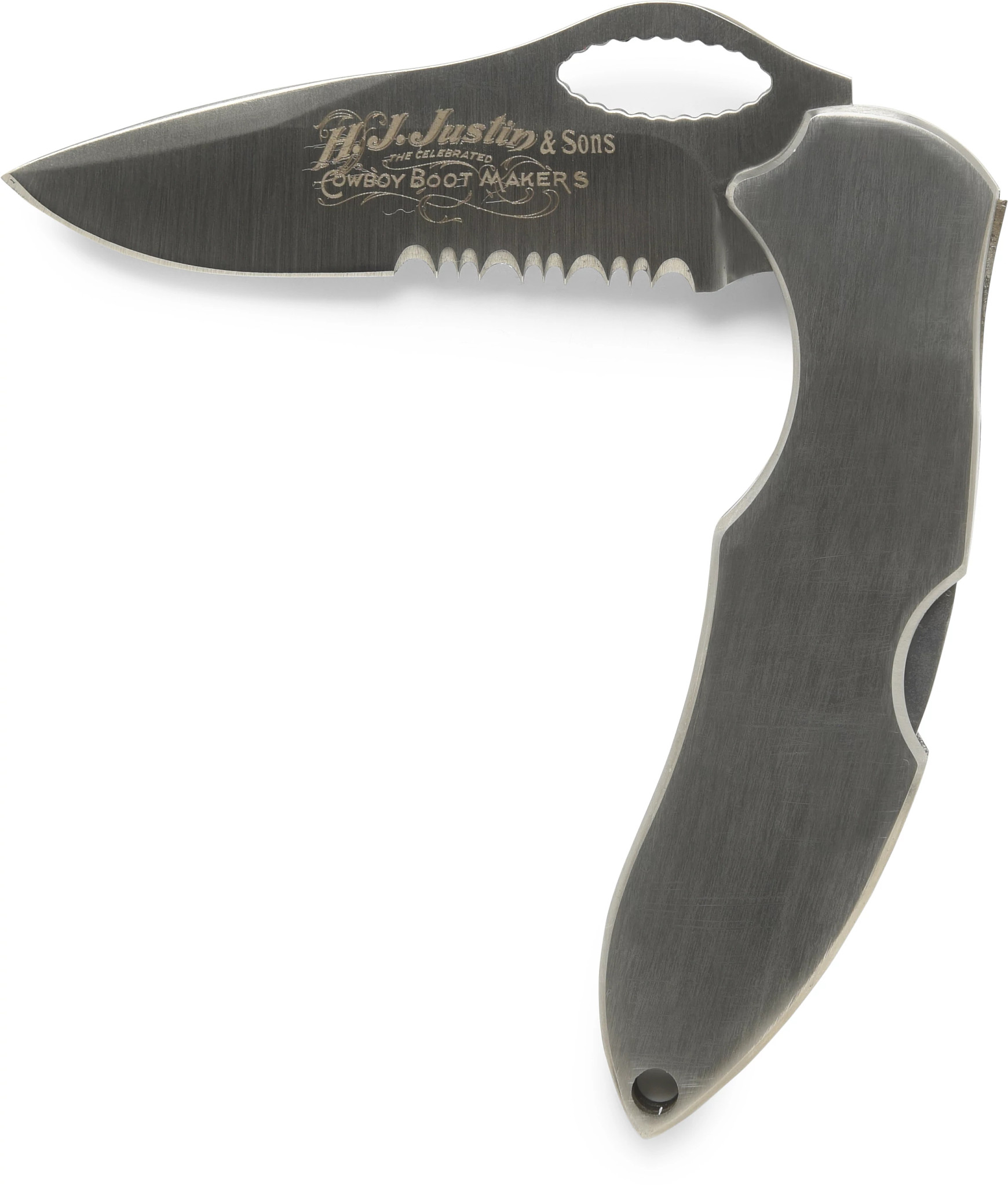 This stainless steel roping knife by H.J. Justin & Sons is a sturdy and versatile tool, perfect for roping enthusiasts and everyday use. Featuring a partially serrated blade with an etched logo, it combines durability and sharpness for reliable performance. The sleek, polished handle offers a comfortable grip, while its compact design ensures easy carrying. A dependable and stylish addition to any toolkit or collection.