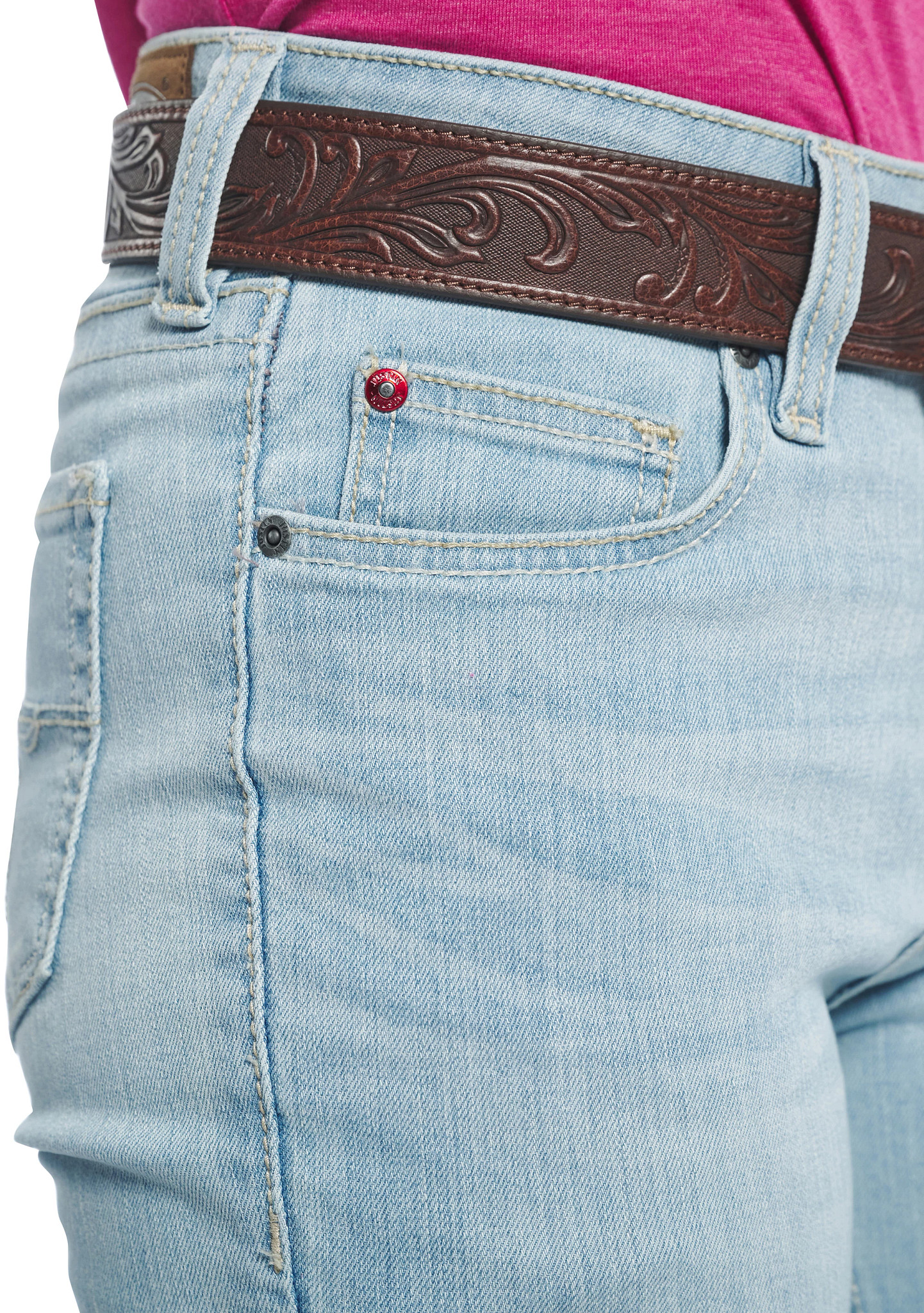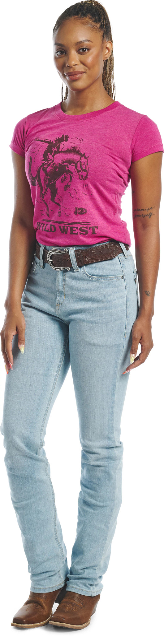 These high-rise straight leg jeans offer timeless style with a modern, flattering fit. Slim through the hips and thighs with perfect stretch for all-day comfort, they’re built for the woman who knows how to stand tall—on the ranch or on the go.