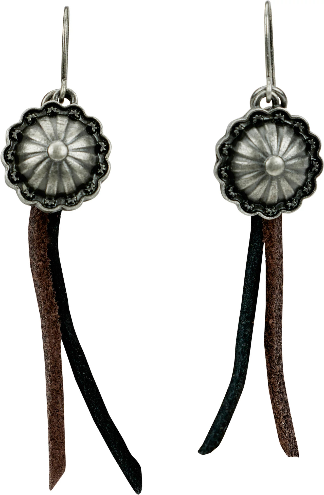 These metal concho earrings with leather tassels exude a rustic charm with a touch of Western allure. The concho elements add a distinctive metallic flair.It’s a perfect fusion of rugged sophistication and laid-back style.