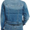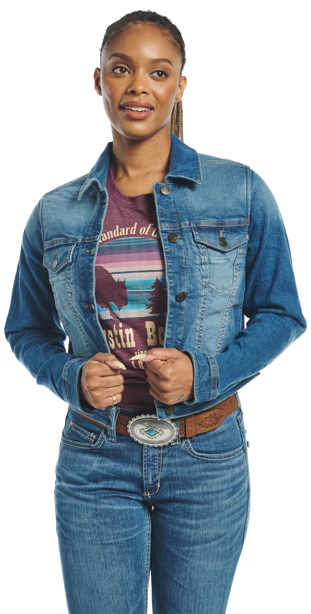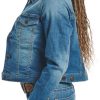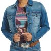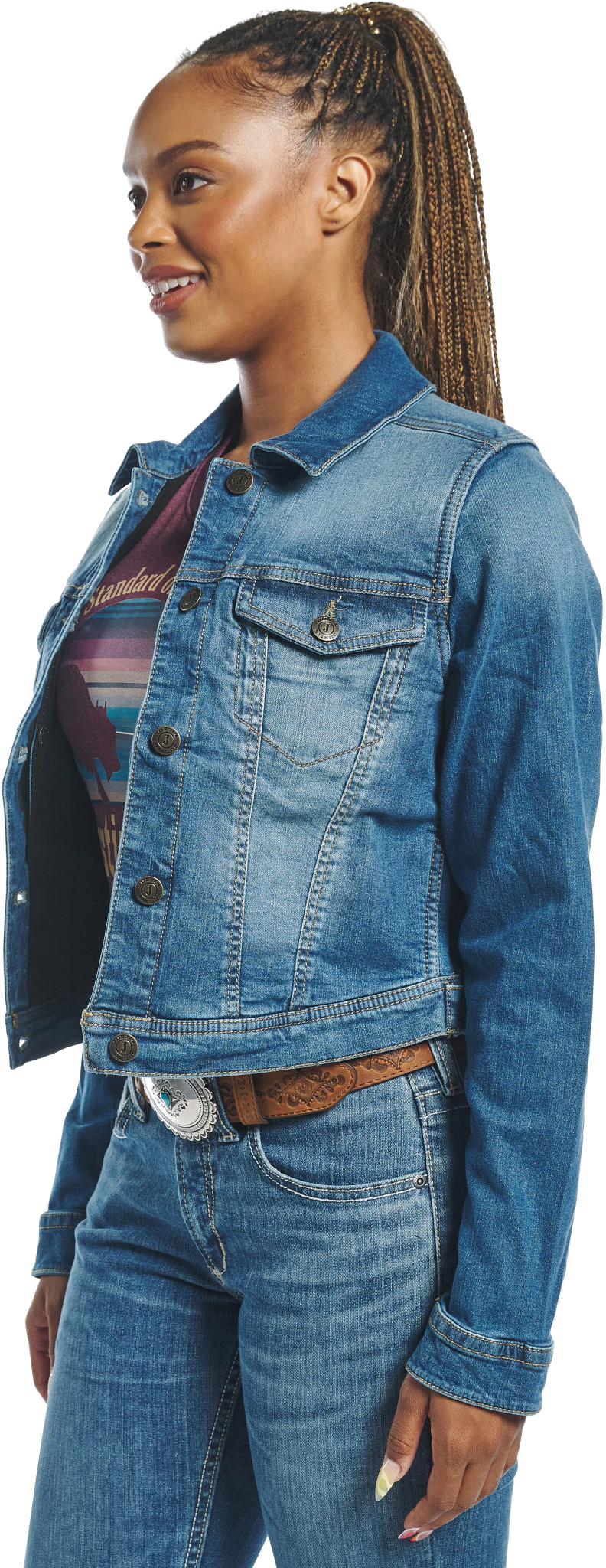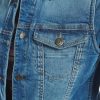 Stylish women’s jacket in medium wash with a button-down front, featuring two upper button-down pockets, an internal conceal carry pocket, and two bottom welt pockets for both fashion and functionality.