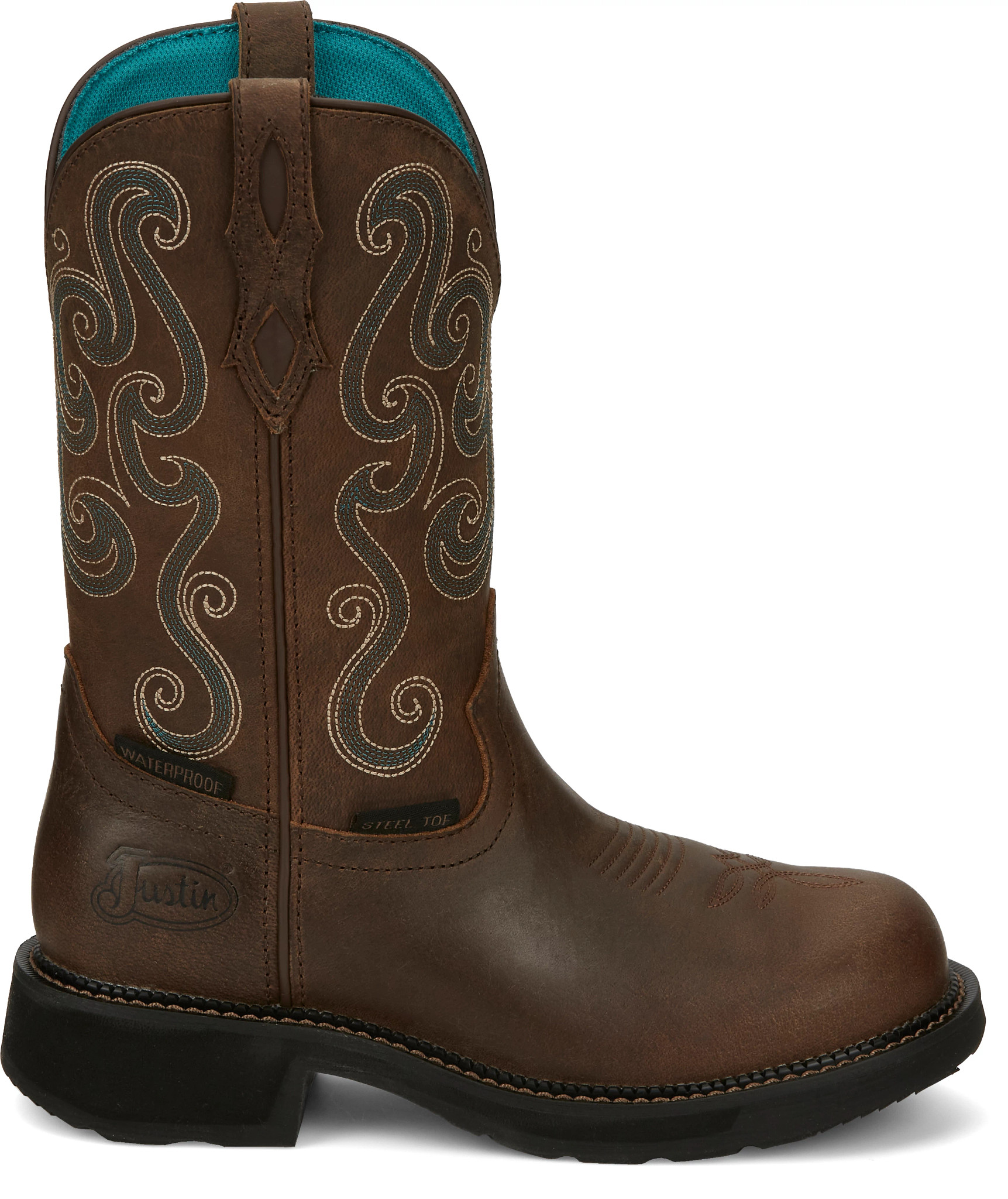 The Tasha 11″ Steel Toe Waterproof women’s Justin Gypsy™ work boot steps on the wild side.