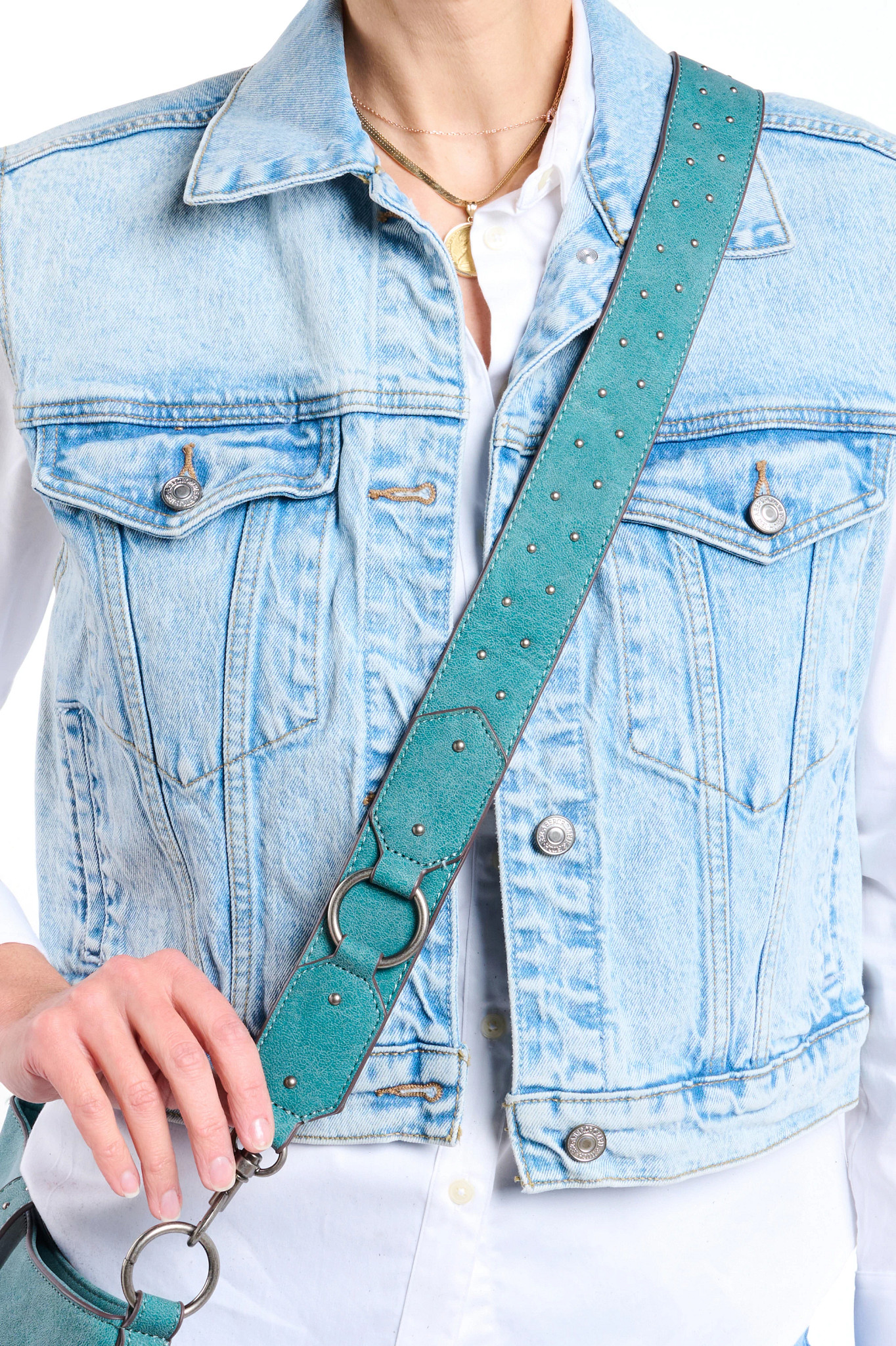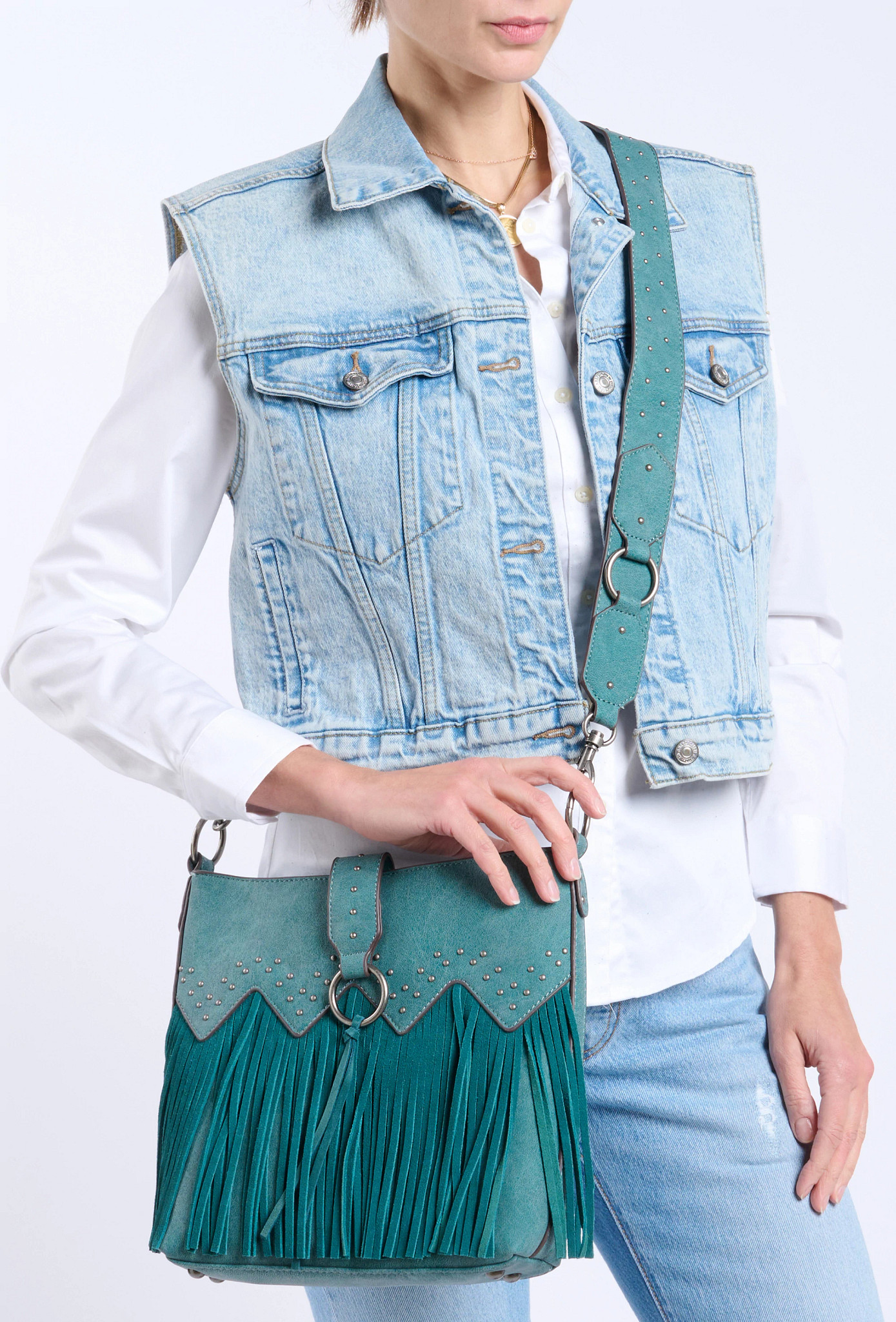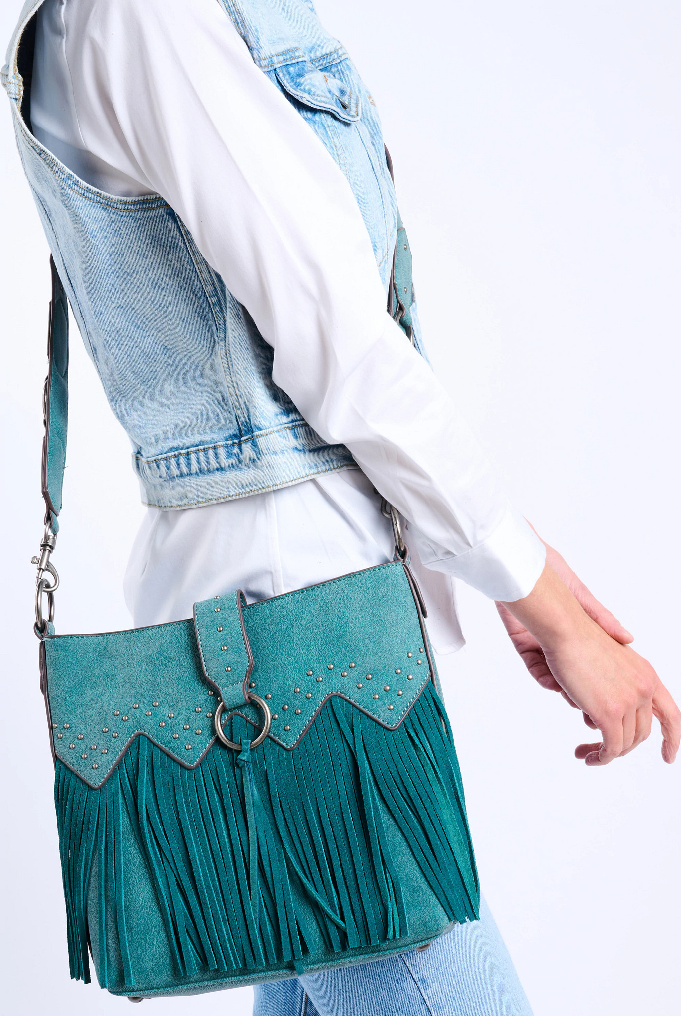 This striking turquoise crossbody tote bag is the perfect blend of style and functionality. It features bold leather fringe and stud embellishments that add a touch of modern flair. Designed for everyday convenience, the bag includes concealed carry pockets on the back, offering both security and ease of access. Whether you’re running errands or out on the town, this tote makes a statement while keeping your essentials organized and within reach.