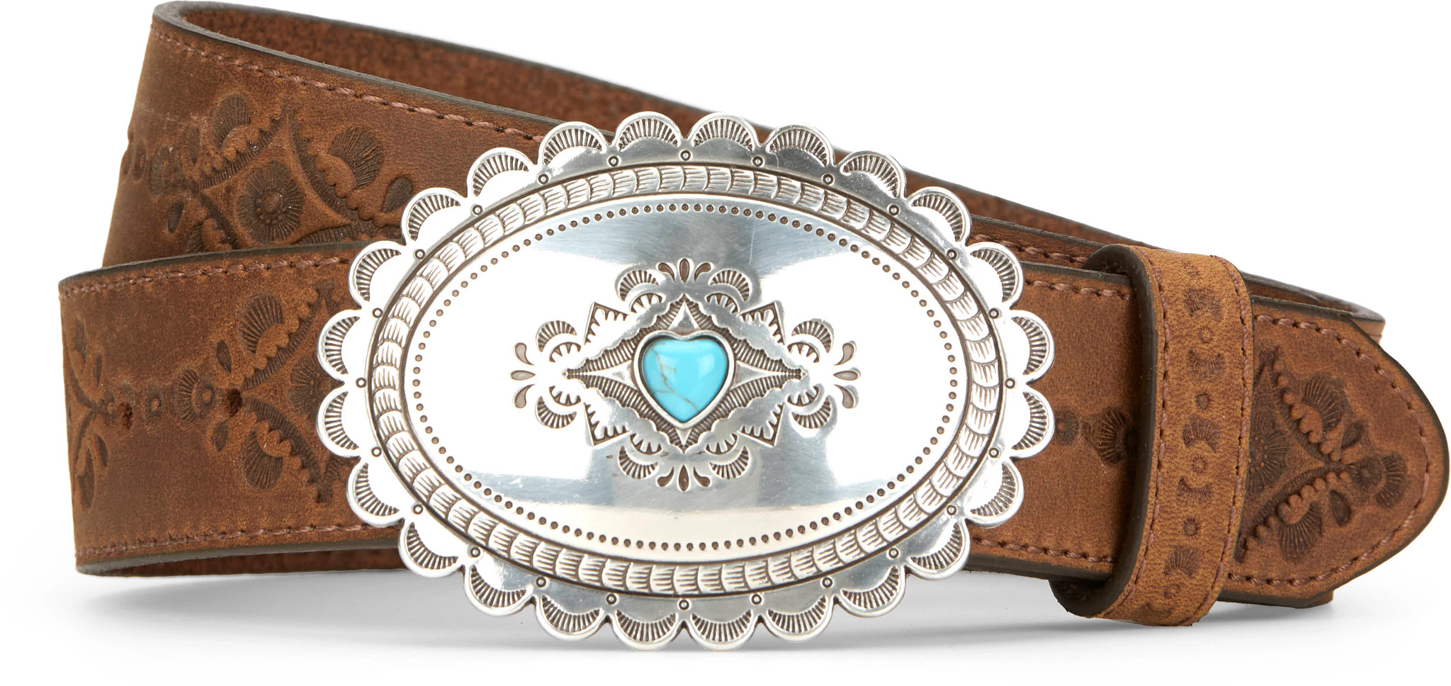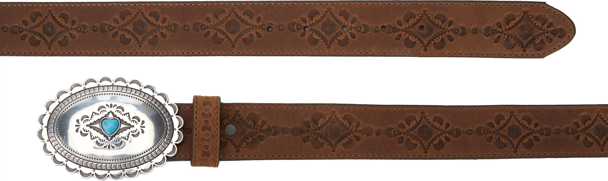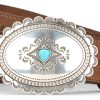 Enhance your wardrobe with this exquisite ladies’ belt. Crafted from high-quality brown leather, it features an elegant oval buckle adorned with intricate turquoise accents. The detailed silver design on the buckle adds a touch of Western charm and sophistication. Perfect for pairing with jeans, skirts, or dresses, this belt combines style and functionality, making it a versatile accessory for any outfit.