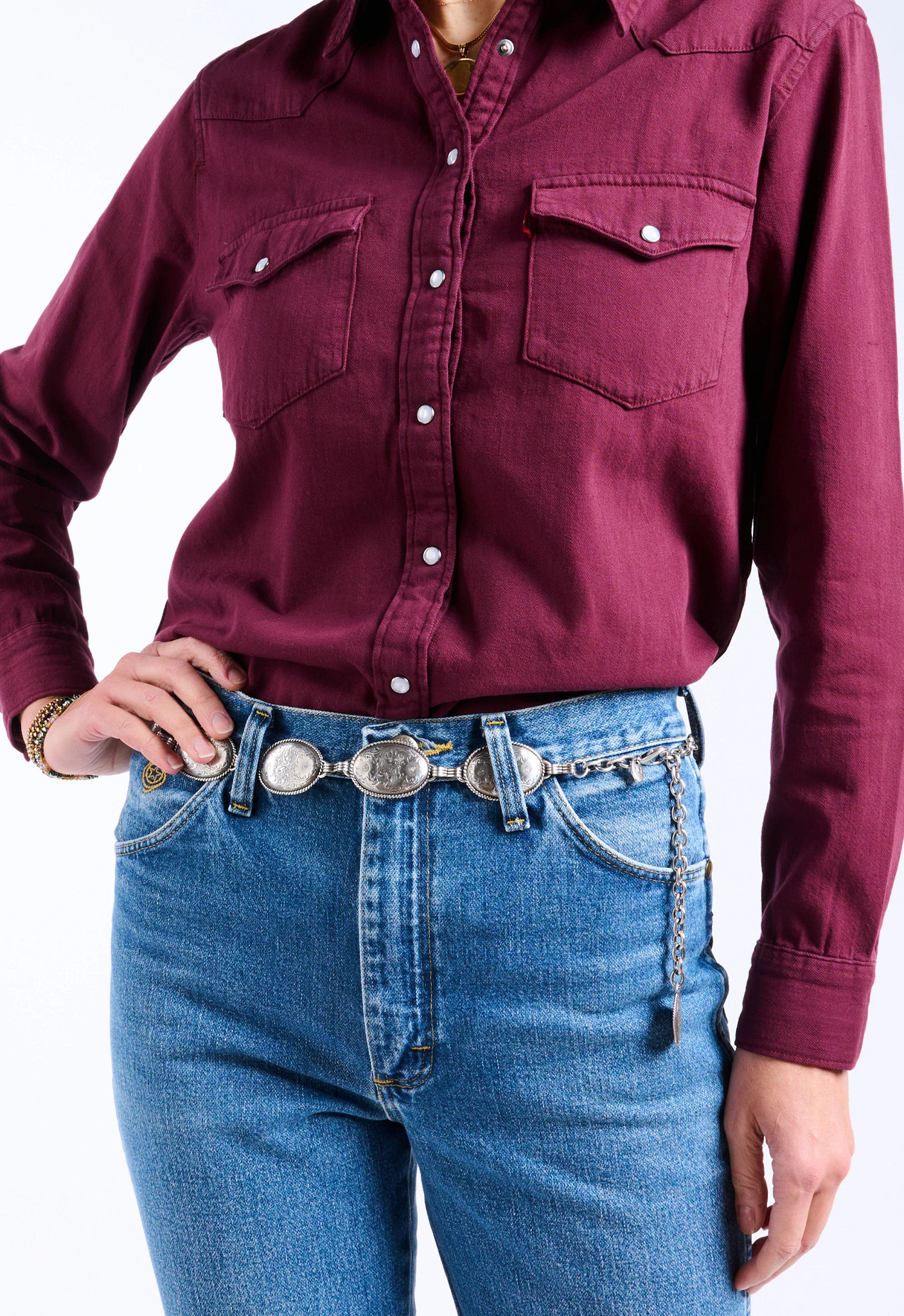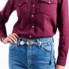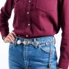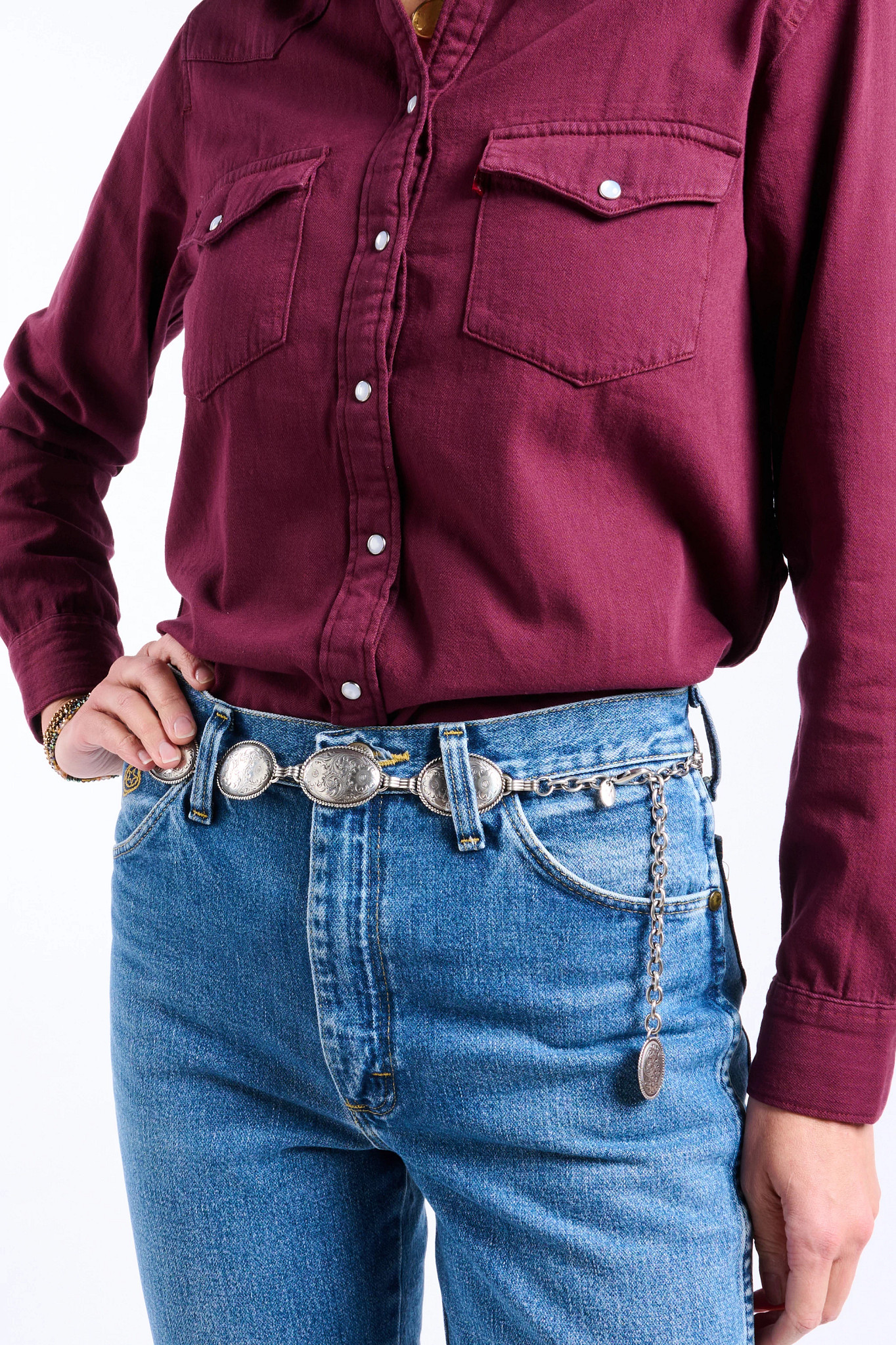 Enhance your outfit with this elegant ladies’ concho chain belt. Featuring intricately designed conchos linked together, this belt adds a touch of sophistication and Western charm to any look. The adjustable chain closure ensures a perfect fit, making it a versatile accessory for dresses, skirts, or jeans. Crafted with attention to detail, this concho chain belt is a timeless addition to your wardrobe that combines style and functionality.